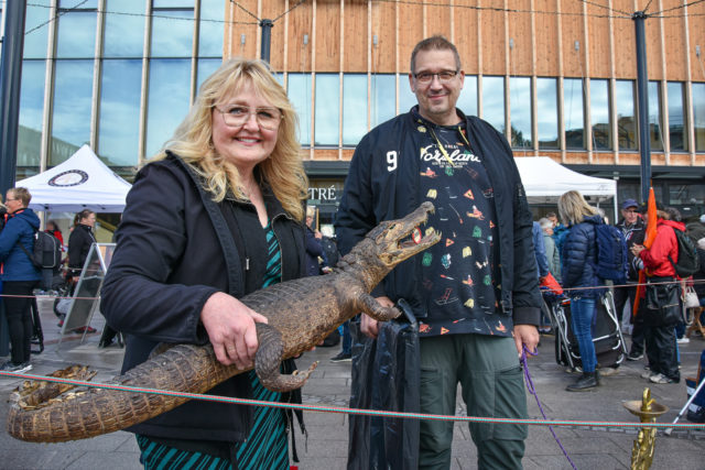 • Kristina Nåvall och Patrick Bygdén berättar att den kommer från en pantbank, där en sjöman pantsatt krokodilen för länge sedan.