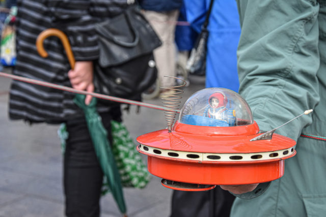 • De har leksaker med sig, bland annat detta rymdskepp från 60-talet.