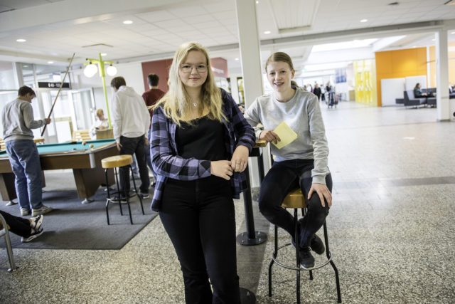 När jag möter upp samhällseleverna Julia Holmlund och Ronja Lindberg under deras håltimme förbereder de fortfarande för valdagen. De stora delarna är nu avklarade – röstsedlar och valurna har levererats, och nu återstår bara att ställa i ordning för valdagen.