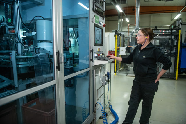 Maskinoperatören Kajsa Wallin är en av dem som jobbar i produktionen på Trelleborg i Ersmark. “Det är jättefräscht, inte alls smutsigt som industrier kan vara – och vare sig du är kille eller tjej har du lika stor chans att utvecklas”, säger Kajsa.