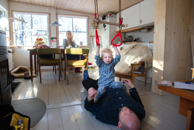 Inne i stugan sitter Linette vid köksbordet, tillsammans med Rasmus yngsta dotter Lima. Natten innan fick de pelletskaminen på plats, men de har inte hunnit installera den än. Linette lånar ut ett par tofflor som värmts upp mot ett element.