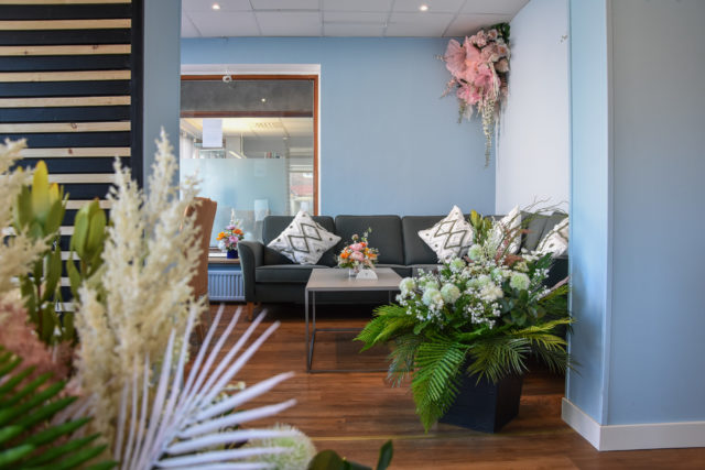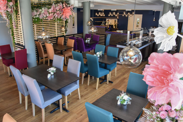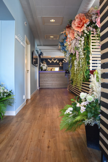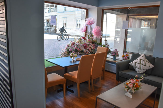 Den renoverade lokalen är full av pastellfärger och ja, en hel del prydnadsblommor i större och mindre arrangemang. Kaj berättar att de är gjorda för hand i Thailand.