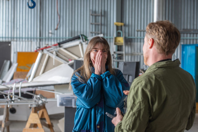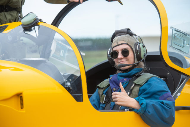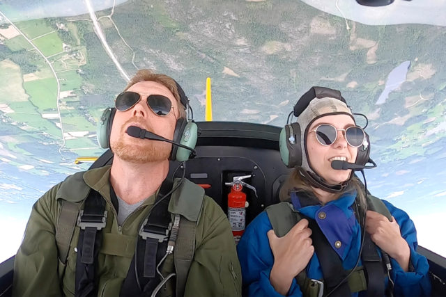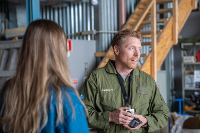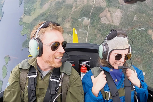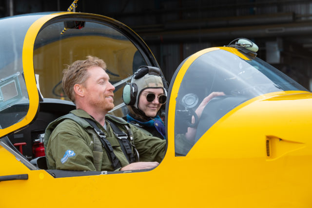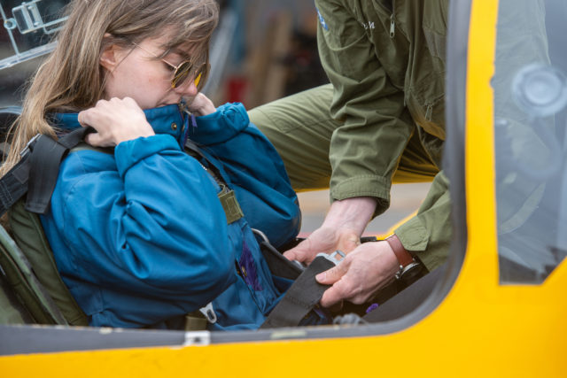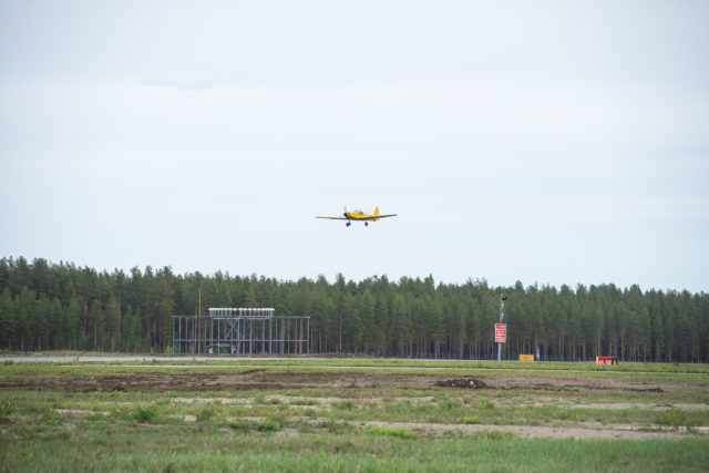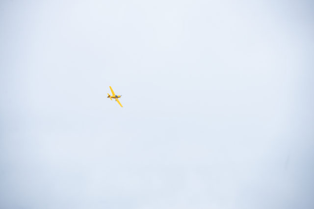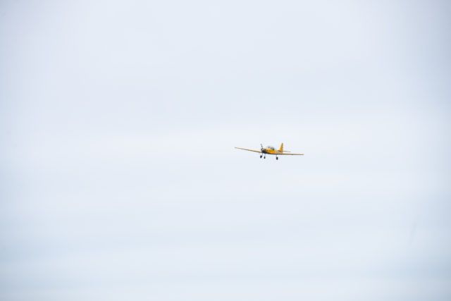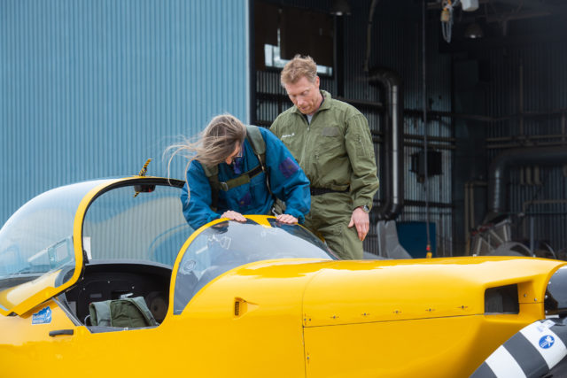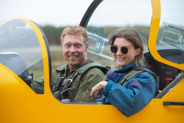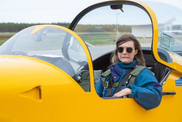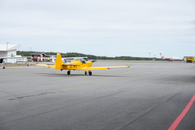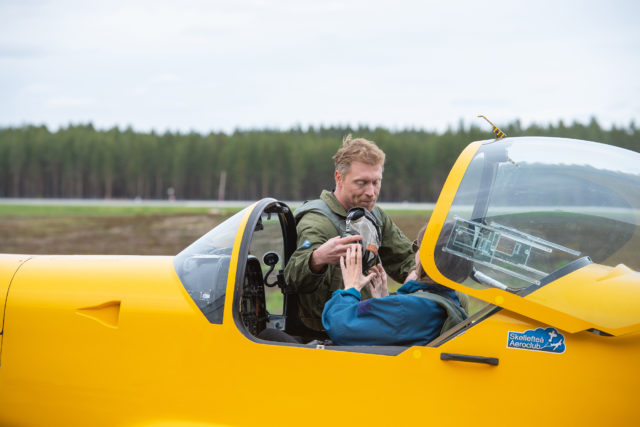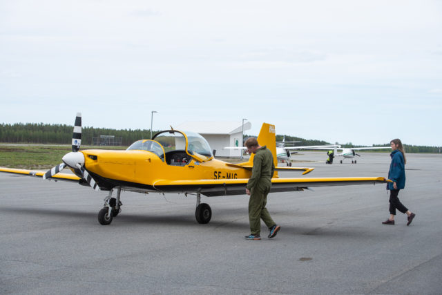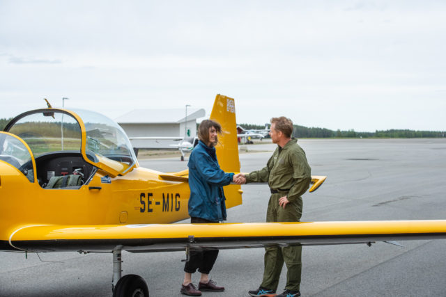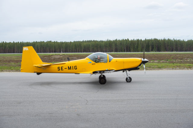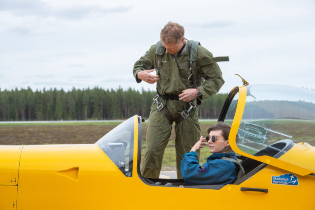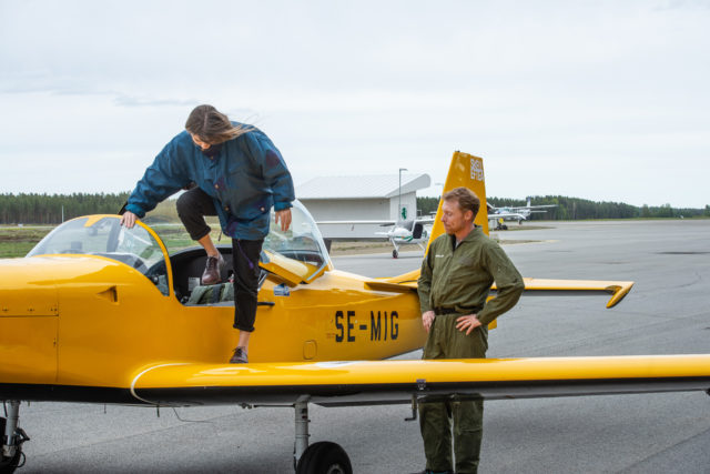 Mattias Markstedt tar in kommunikationen från sin plats i det gula planet, ännu på marken. Han drar i spakar, trycker på knappar och kollar av instrumenten medan oljan i planet värms upp till en lämplig flygtemperatur. Klädd i en grön overall, med pilotglasögon på näsryggen ser han ut att vara tagen direkt ur en film.
