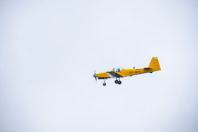 Turen är över och Mattias Markstedt styr det lilla gula flygplanet åter mot flygplatsen för landning. Flygledaren ger klartecken och planet börjar sjunka. Ett par gäss passerar och Mattias anropar flygtornet för att varna nästa pilot, innan hjulen på SE-MIG får fäste mot landningsbanan.