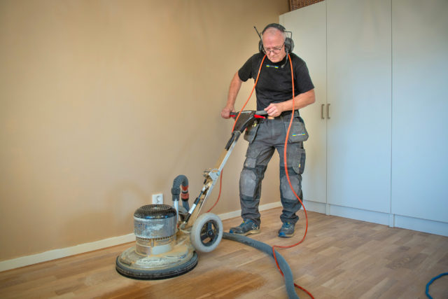 När jag träffar Leif slipar han ett parkettgolv med rondellslip. En annan typ är bandslipen som kan vara effektiv om golvet har fastsittande ludd och lim från en tidigare plastmatta.