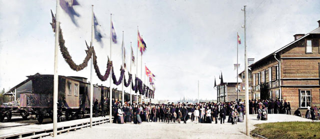 Invigning av stambanan mellan Vännäs och Boden 1894. Närmast till höger är Järnvägshotellet i Jörn. Bild: C Franke / Skellefteå museum, färglagd av Stig Sandström