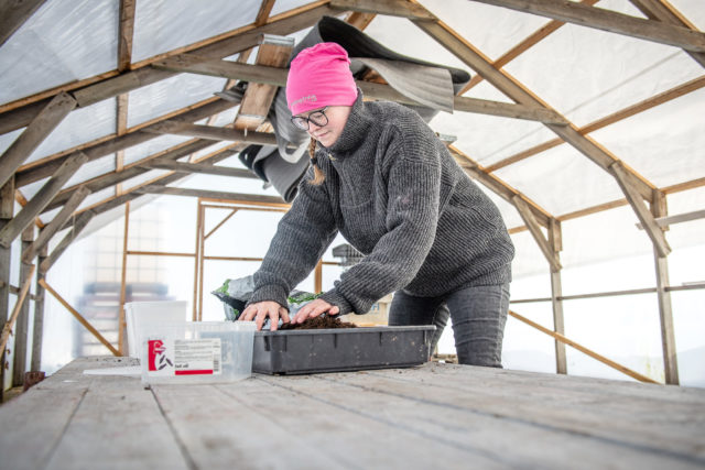 Malin Lindkvist jobbar just nu för fullt med att förså purjolök, salladslök, tomat och chili. Lagom tills att snön smält bort och jorden torkat upp, i slutet av maj eller början av juni, är det dags att plantera ut de små skotten i landen. Ett jobb som kräver många händer.