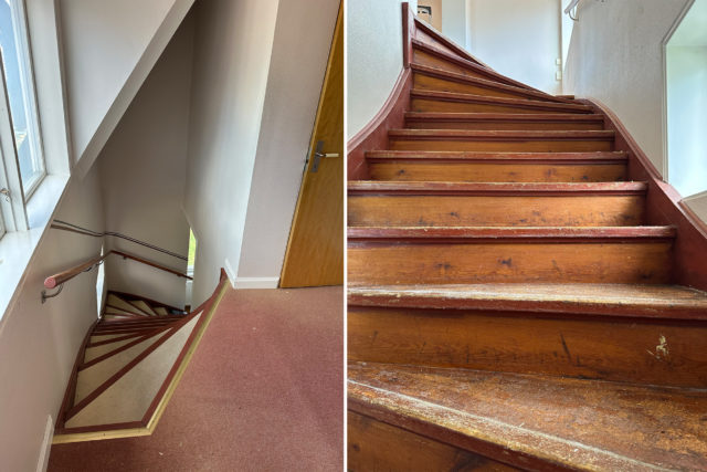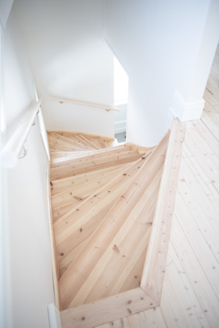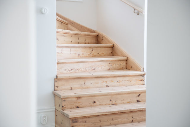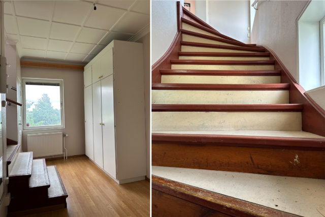 – Det är sånt vi gjort när vi haft tid och känt lust. Trappan var plastad och innan dess fernissad. Jag provade allt för att få bort limmet men det som i slutändan fungerade var färgskrapa och ilska, säger Frida.
