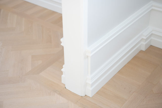 För att skapa en enhet på nedervåningen har en ny men likadan parkett lagts även i köket. Breda tak- och golvlister ger ett tidstypiskt intryck.