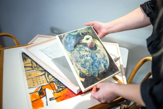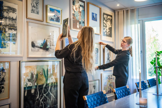– Vi inventerade förrådet och tog fram en mix av tavlor som vi sen la ut på golvet framför väggarna för att få en bild av hur det skulle hängas, berättar Maria.