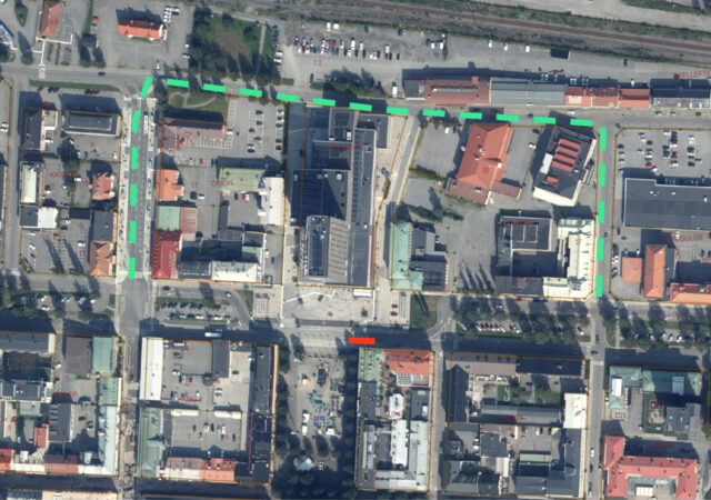 Platsen för arbetet är markerat i rött och föreslagen omledningsväg i grönt. Karta: Skellefteå kommun