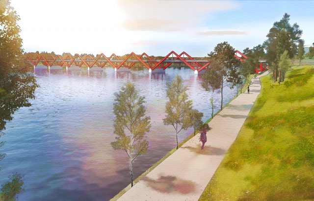 Den ursprungliga visionen för Karlgårdsbron från strandpromenaden sett. I dagsläget bedöms bron kunna öppna för trafik sommaren 2027 så länge det inte dyker upp fler oförutsedda problem. Foto: Skellefteå kommun