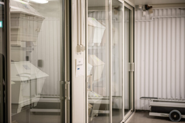 • När kistorna levereras förvaras de i ett särskilt rum i väntan på kremering. Här förvaras också de kistor som ska kistbegravas på Alhems kyrkogård och de kistor som inte ska kremeras förrän efter begravningsceremonin. Foto: Caroline Thorén