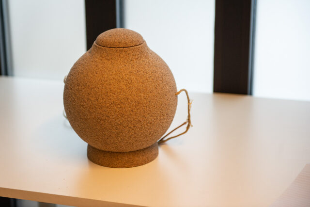 • En urna gjort av sand, särskilt utformad för att kunna sänkas i havet och där lösas upp. Foto: Caroline Thorén