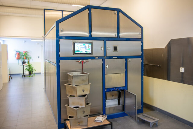 • Kremationsugnen i Skellefteå hanterar en vikt på max 250 kilo inklusive kistan. Hur lång tid kremeringen tar beror på den avlidnes vikt, kön och kroppsbyggnad men i snitt tar det 1 timme och 25 minuter. Foto: Caroline Thorén