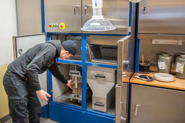 – Innan vi maler askan tar vi bort höftkulor och annat kirurgiskt material. Eventuella spikar och skruvar från kistan sorteras automatiskt bort i kvarnen. Därefter placerar vi askan i en linnepåse och ställer den i det rum där vi förvarar askan tills den hämtas av de anhöriga eller begravningsbyrån, berättar Emil.