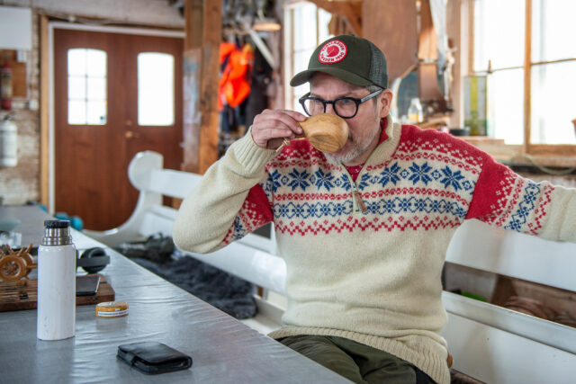 Jag vet att Mattias Sjöstedt är dokumentärfilmare och konsult i den beredningsgrupp på SVT som beslutar vilka dokumentärer som ska få finansiellt stöd. Men under den stund jag tillbringar i hans båthus förstår jag att det är långt ifrån allt han gör. Han jobbar också deltid med filmutbildningen på Edelviks folkhögskola, lär människor att basta och bada vinterbad i Kurjoviken, har anordnat konserter och sommarcafé hemma vid båthuset, arrangerat båtturer längs älven och gjort en bildutställning om flottning i sin numer avlidna vän Oves namn. För att nämna några saker.