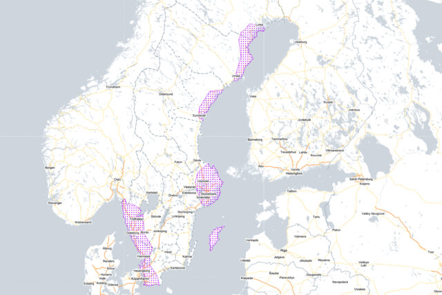 Områden där SMHI flaggar för stor gräsbrandsrisk under dagen. Foto: Skärmdump från SMHI