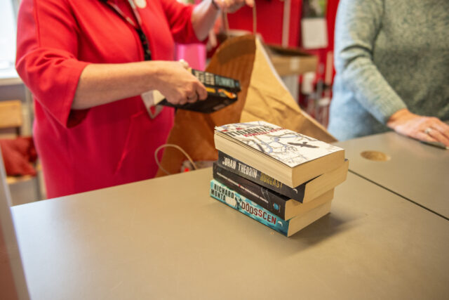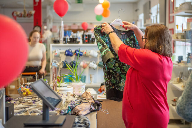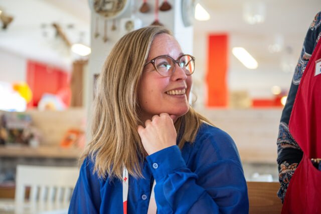 Det är fullt ös på Röda Korsets second hand-butik den här onsdagen. Jubileumsveckan, då man firar att verksamheten funnits i 25 år, är i full gång med aktiviteter och erbjudanden. Den här dagen får kunderna fylla en kasse med kläder för endast 50 kronor – ett erbjudande som fått kunderna att hänga på låset redan vid öppning. Siv Aspbäck, butiksansvarig, har rosiga kinder och en glädjens energi som präglar hela butiken.