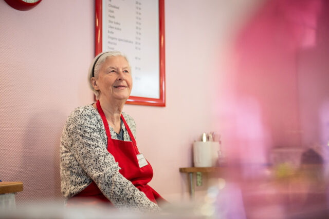 Det blev långtråkigt att bara vara hemma. Så nu är jag här varje onsdag i kaféet där jag både hjälper till och får möjlighet att träffa och prata med människor.
