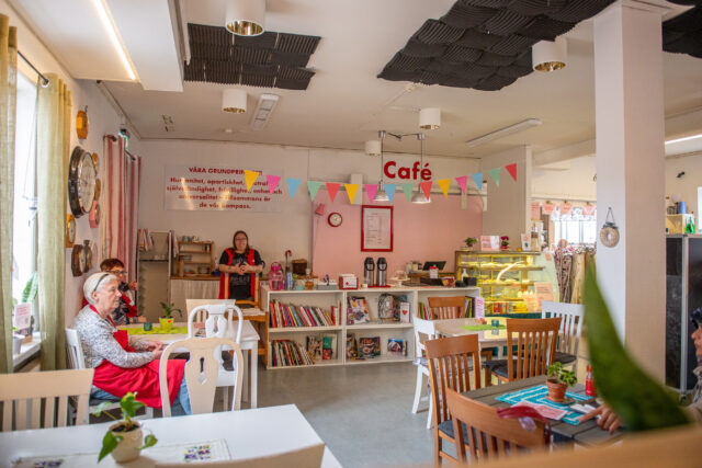 I kaféet jobbar volontärerna Margaretha Karlsson och Annika Lindström. Efter pension kände de båda att de ville göra en insats och samtidigt träffa folk och få ett sammanhang, överbrygga den klyfta som det kan innebära att gå från ett aktivt yrkesliv till den mer stillsamma pensionärstillvaron.