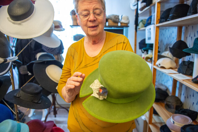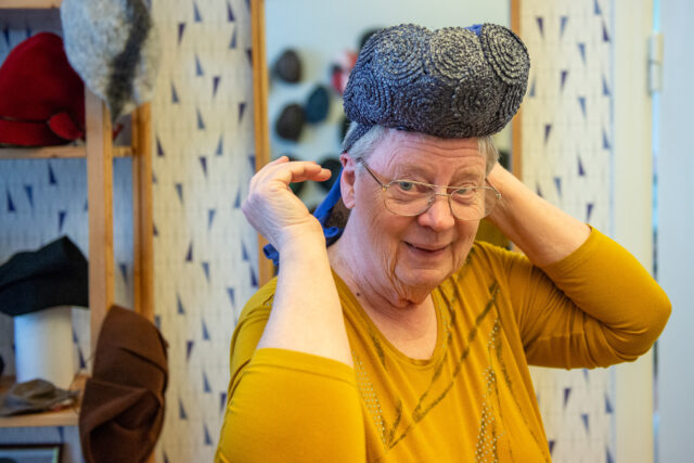 – Det var en modist från Sveg som kom upp en fem, sex gånger och höll kurser i Arvidsjaur. Under två års tid lärde vi oss hur man utför hantverket, säger Pia och visar en av sina egentillverkade hattar.
