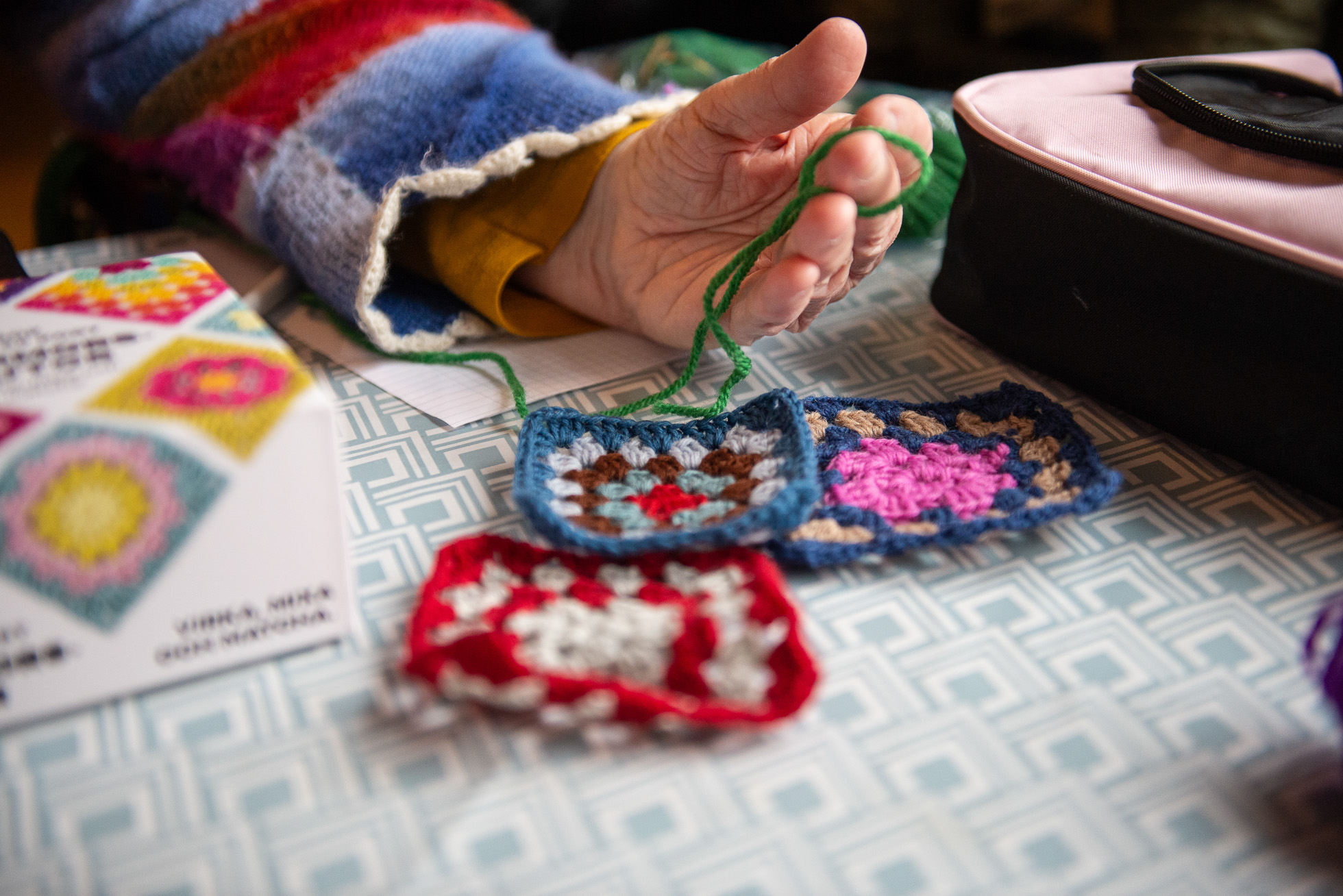 Trots att det virkande gänget bara träffats en gång tidigare har de redan fyllt en back med virkade mormorsrutor i alla möjliga färger. Många virkar även rutor hemma och tar med och det har även inkommit donationer från människor runt om i samhället.