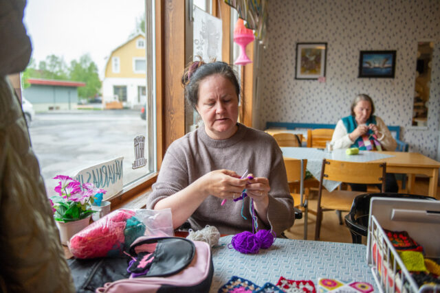 Egentligen kom jag till Burträsk den här regniga junidagen för att besöka Hattmuseet som delar lokal med Nävarnas Hus. Men i entrén möter jag åtta kvinnor som sitter och virkar. Givetvis måste jag stanna till och ta reda på vad de gör.