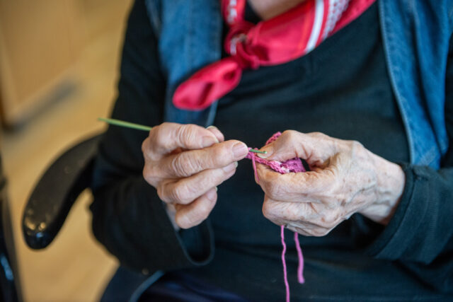 På Nävarnas Hus i Burträsk pågår arbetet med att virka så kallade mormorsrutor som ska resultera i en julgran lagom till skyltsöndag. Foto: Caroline Thorén