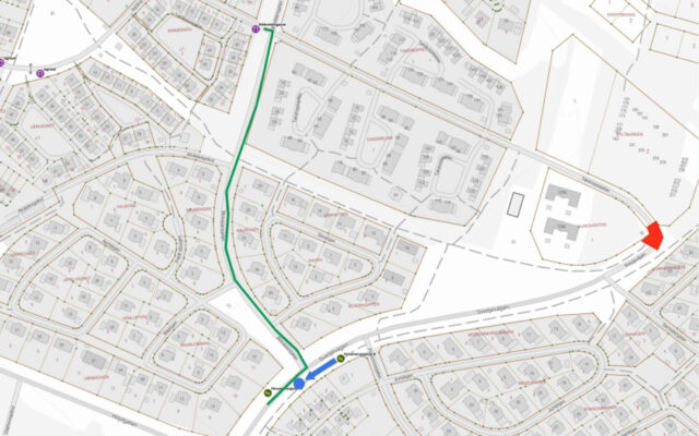 Under arbetet kommer hållplatsen ”Försommargatan B” att flyttas till precis söder om Blidvädersgatan, se blå punkt på bilden, och bussarna att ledas om via Blidvädersgatan enligt den gröna linjen i bild.