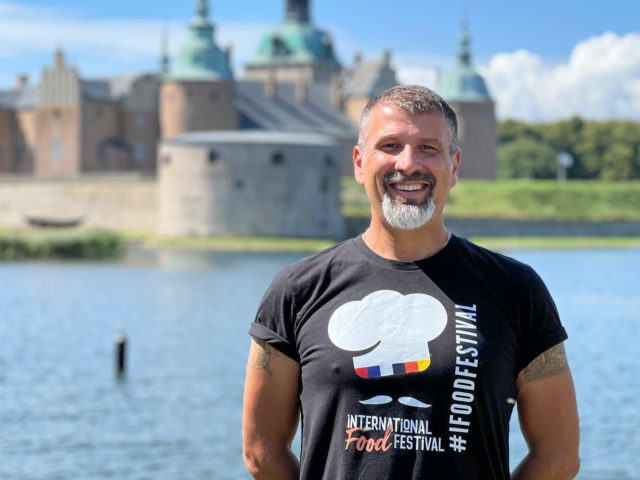 Robert Norrhede är eventansvarig vid Geraud Markets som arrangerar den internationella matfestivalen. Här framför Kalmar slott i samband med 2024 års turné. Foto: Privat
