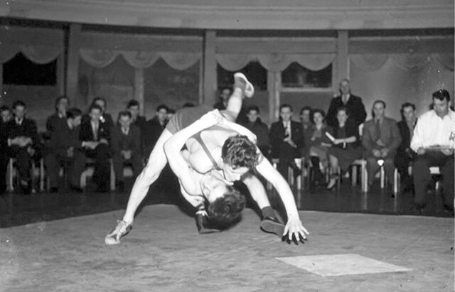 Det har inte bara dansats på Rotan i Skelleftehamn. 1953 arrangerades DM i brottning där Rönnskärs Ivan Lundmark, på bilden i underläge, besegrade Lyckseles B O Jonsson i klassen bantamvikt. Foto: Nordsvenska Dagbladet / Skellefteå museum