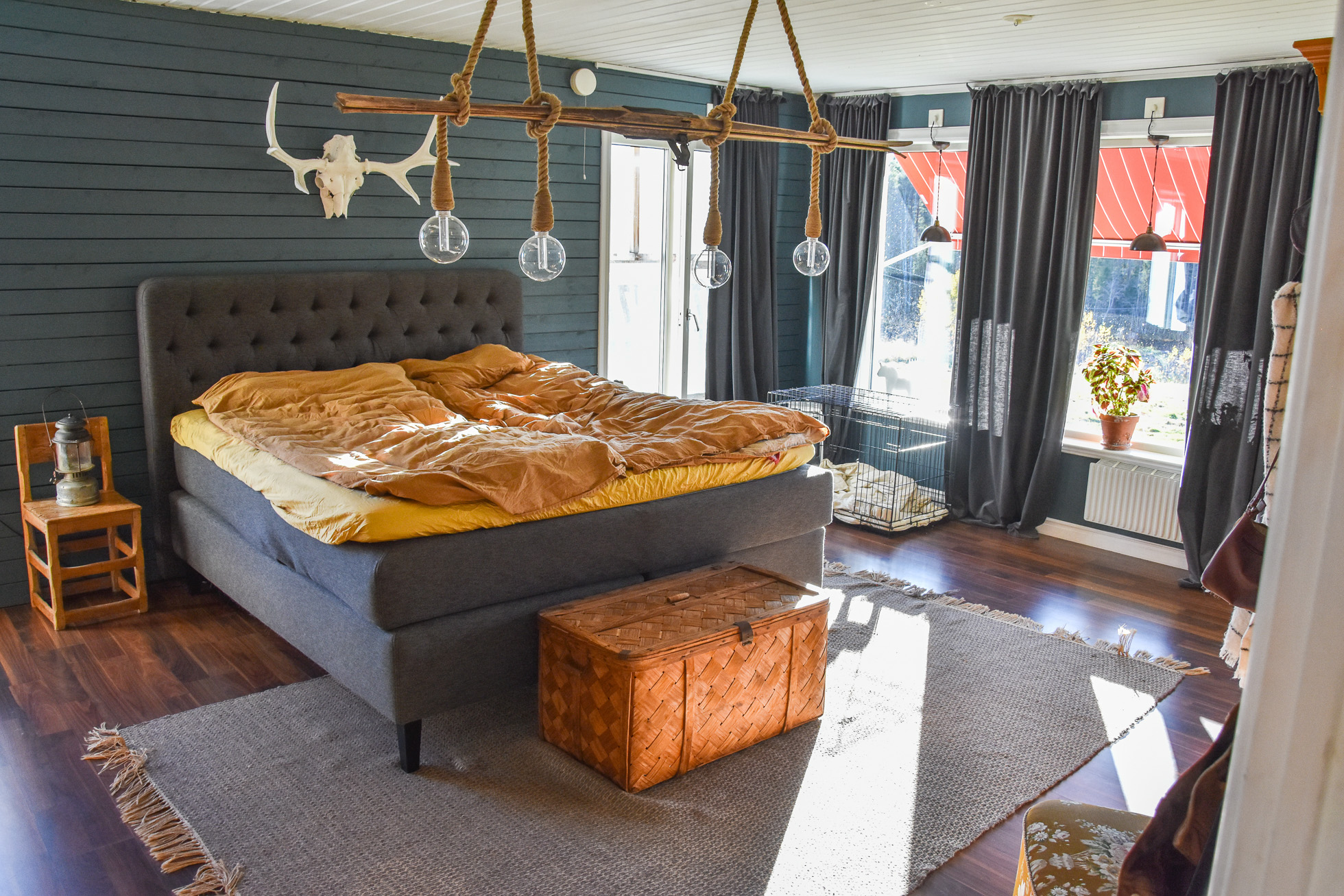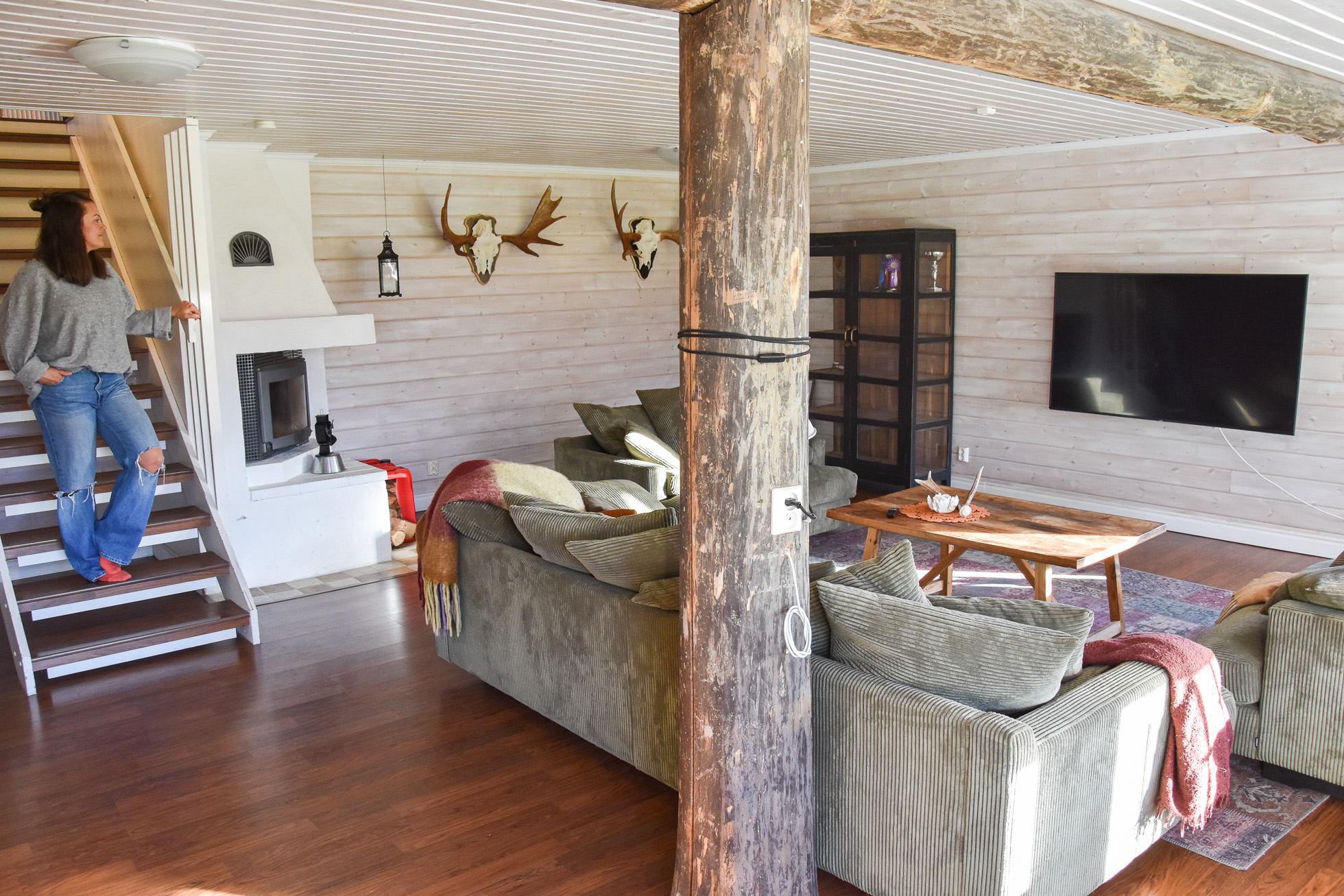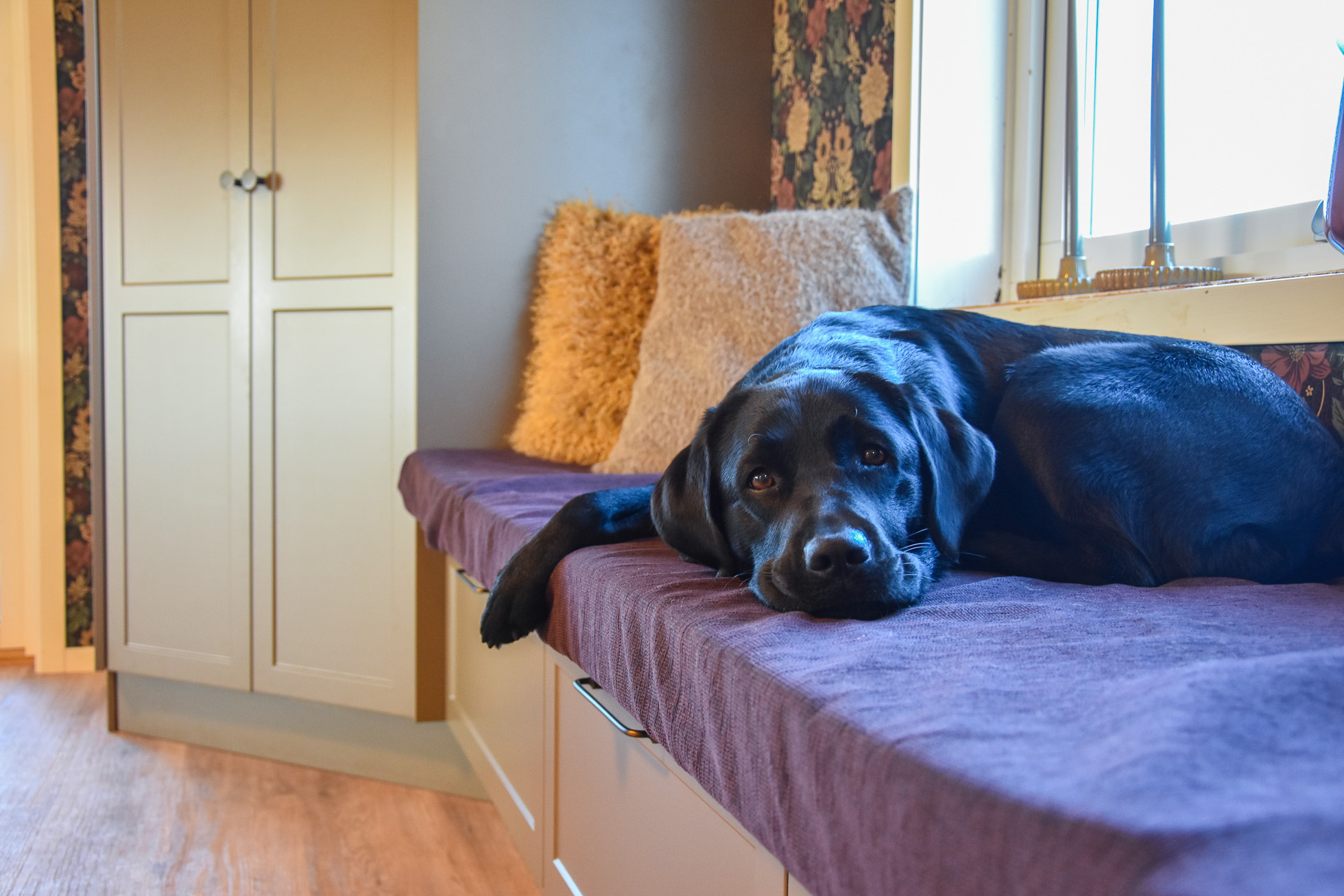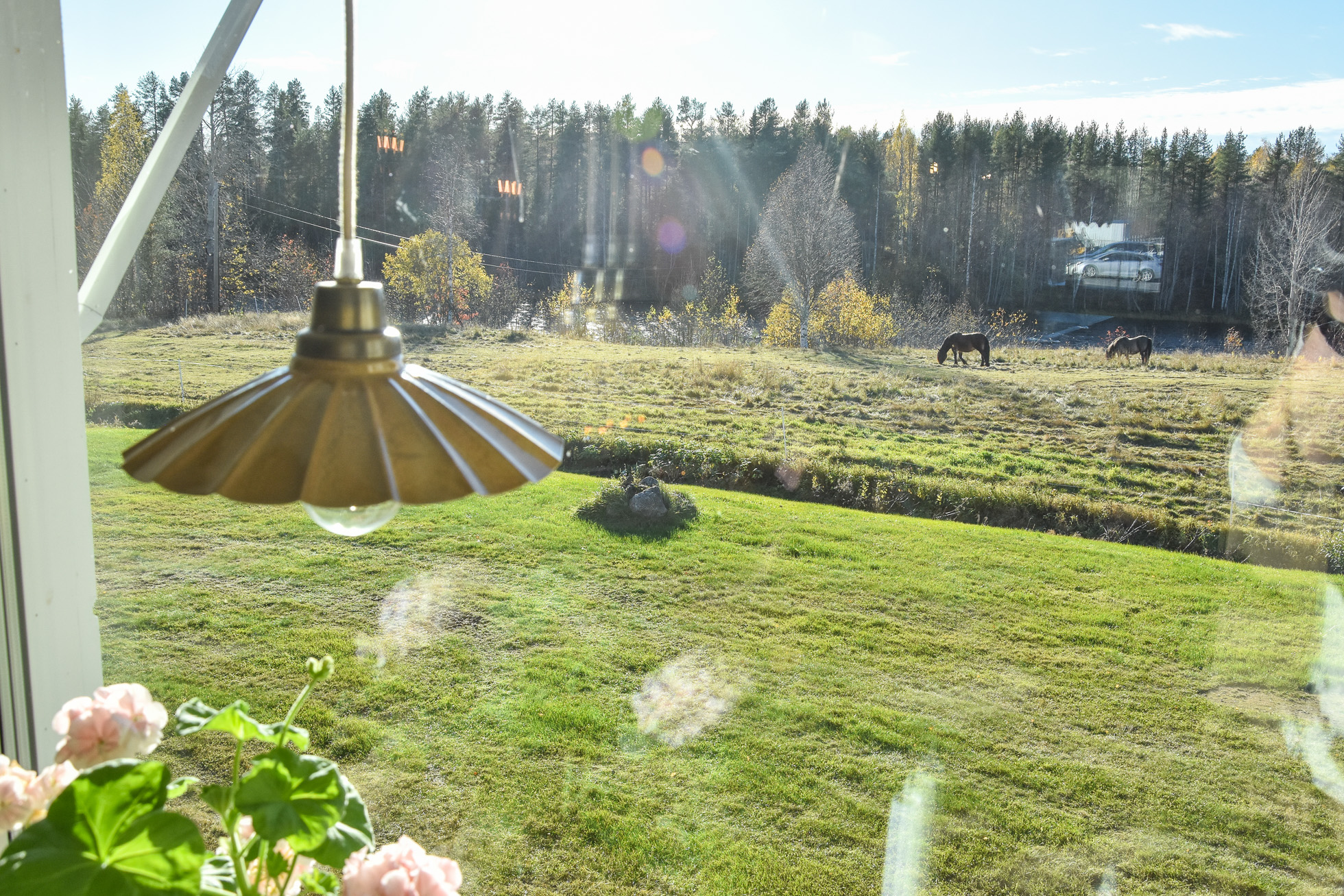 Den 2-åriga labradortiken Myrra tar snällt plats i en soffa i köket och genom de stora fönstren mot Byskeälven syns nordsvenska brukshästar beta på ängsmarken nedanför. Just köket är biten som Jeanette och Ulrik väntat med tills nyligen, men nu är också den renoveringen gjord och Jeanette har planer för trappan till nedervåningen härnäst.
