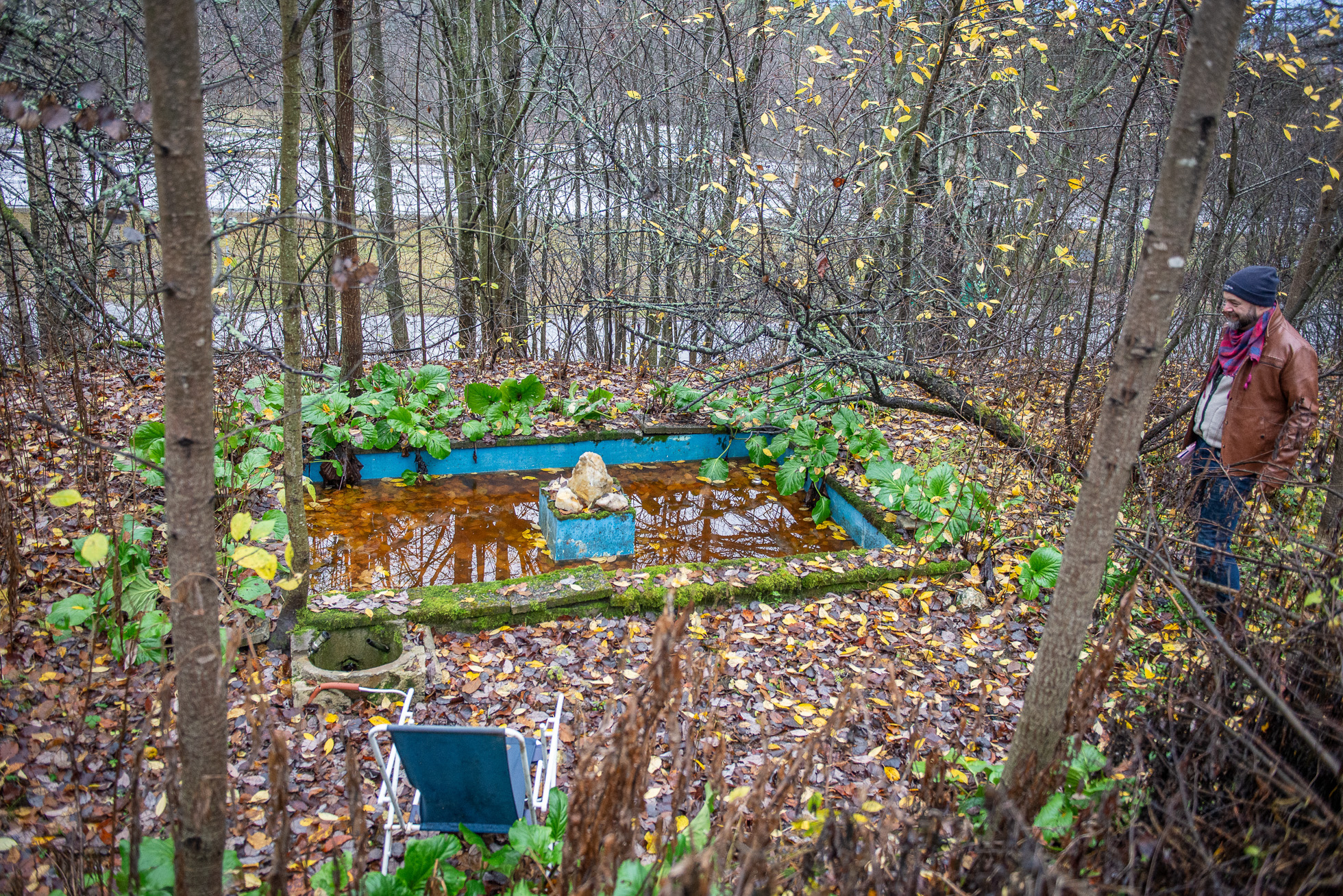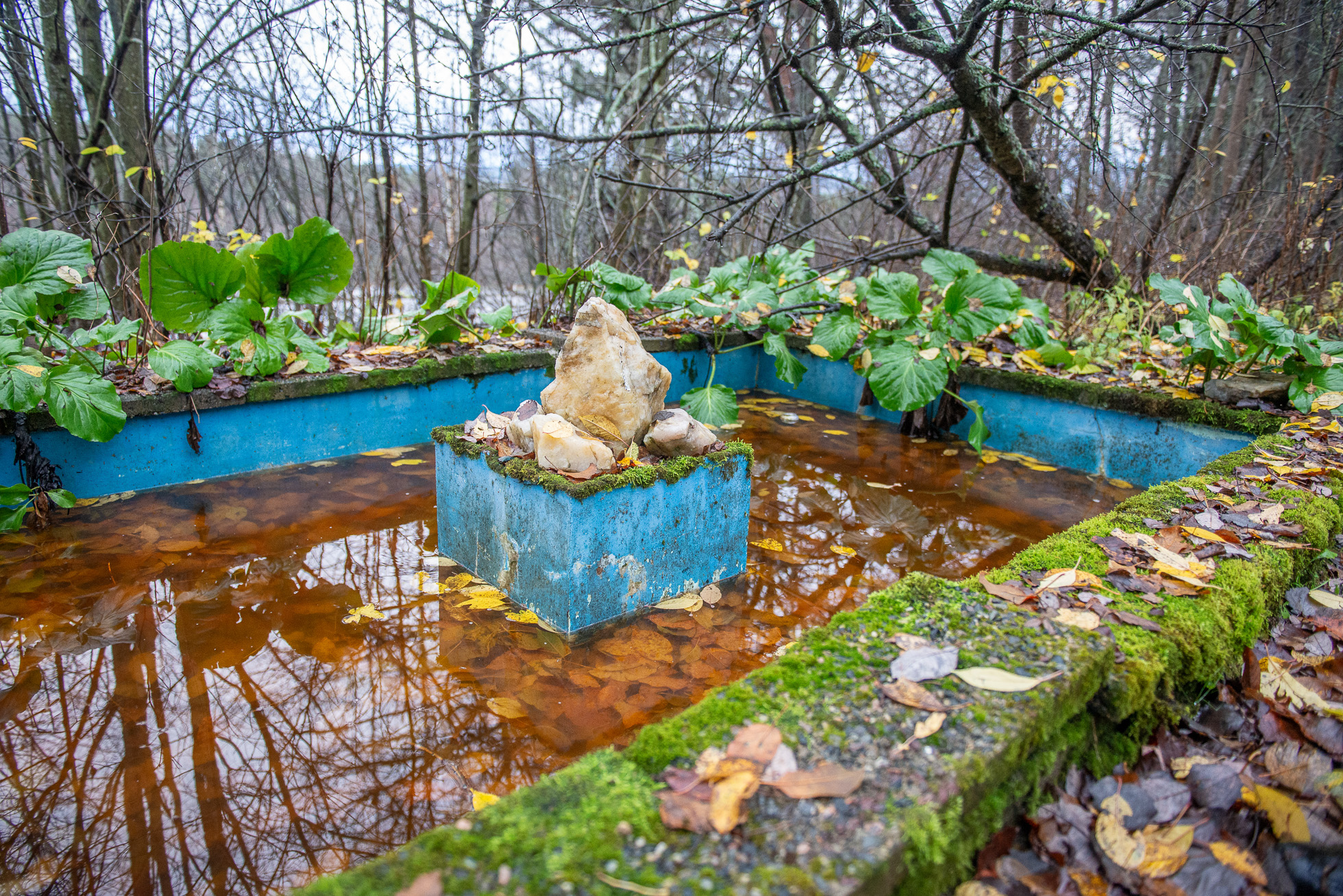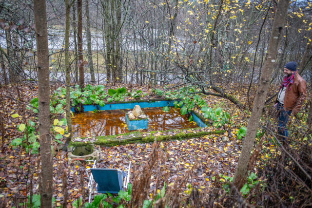 Höstfukten börjar tränga in i mina skor när vi rört oss genom skogen i närmare en timme. Stengrunder, brunnslock och flaggstänger i all ära men det är något annat jag är på jakt efter. En trädgårdsdamm jag sett på en bild i internets djupa vrår. Vi letar upp bilden och försöker utläsa ungefär var den kan vara tagen. Och efter ännu fler forcerade buskage och nedfallna träd ser jag nåt blått skymta mellan träden. Och där är den: en trädgårdsdamm med blå insida, i mitten en platå med några stora kvartsstenar, runt om stenläggning och en trappa som leder upp mot den plats där huset låg. Som en hälsning från en annan tid, ett monument över tidens gång och en människas kärlek till en plats som övergetts och sakta fallit i glömska.