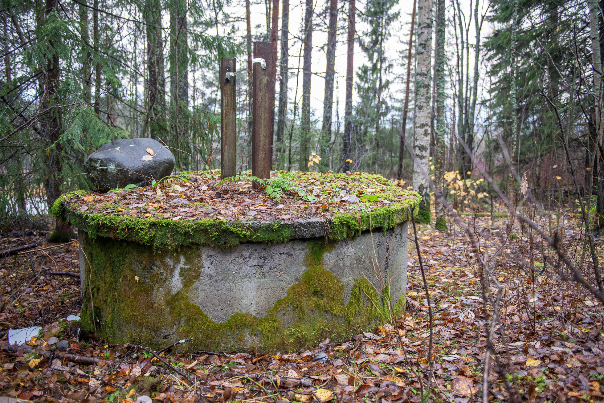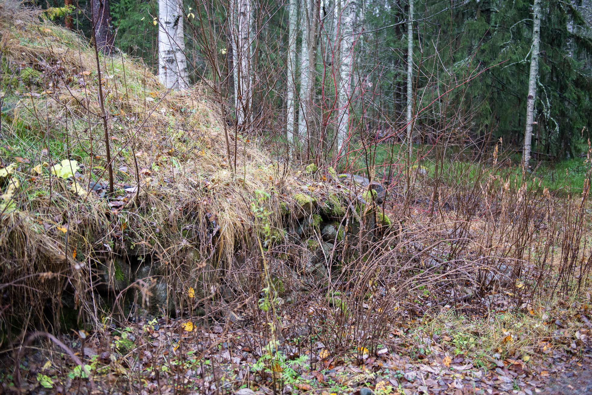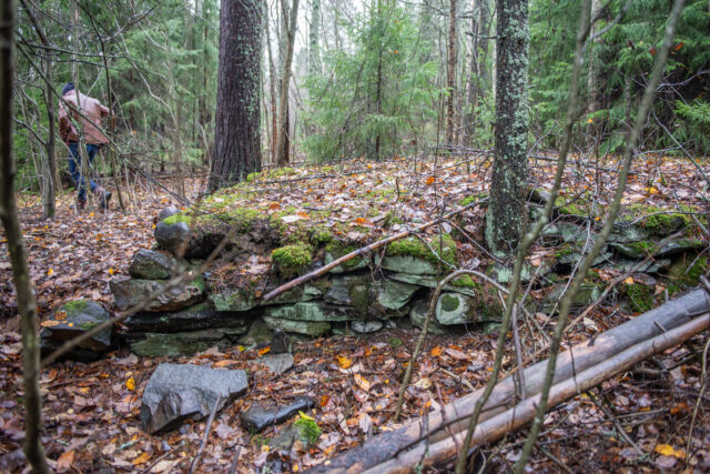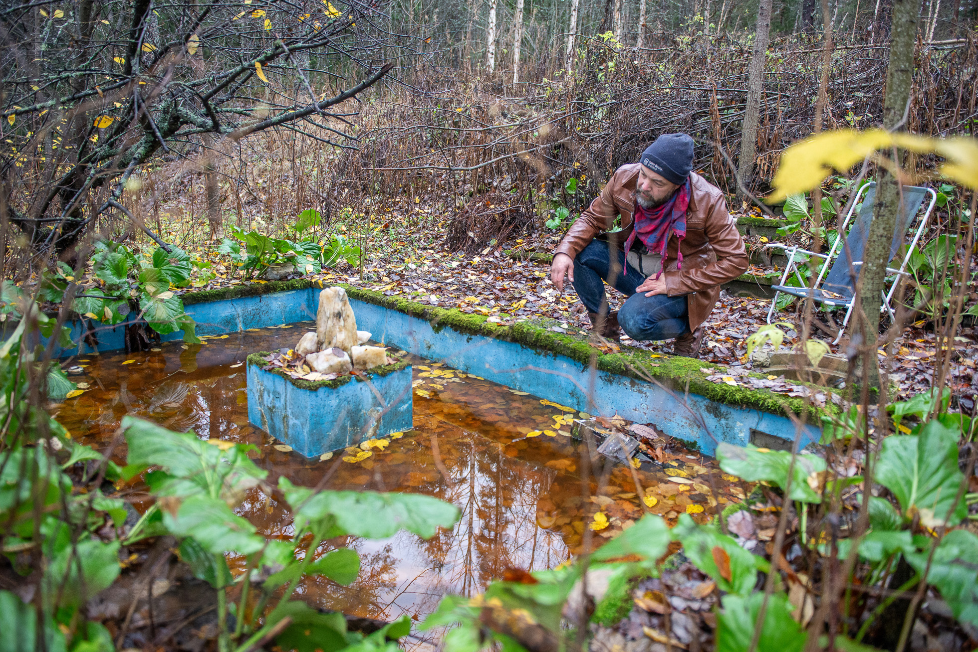 Höstfukten börjar tränga in i mina skor när vi rört oss genom skogen i närmare en timme. Stengrunder, brunnslock och flaggstänger i all ära men det är något annat jag är på jakt efter. En trädgårdsdamm jag sett på en bild i internets djupa vrår. Vi letar upp bilden och försöker utläsa ungefär var den kan vara tagen. Och efter ännu fler forcerade buskage och nedfallna träd ser jag nåt blått skymta mellan träden. Och där är den: en trädgårdsdamm med blå insida, i mitten en platå med några stora kvartsstenar, runt om stenläggning och en trappa som leder upp mot den plats där huset låg. Som en hälsning från en annan tid, ett monument över tidens gång och en människas kärlek till en plats som övergetts och sakta fallit i glömska.