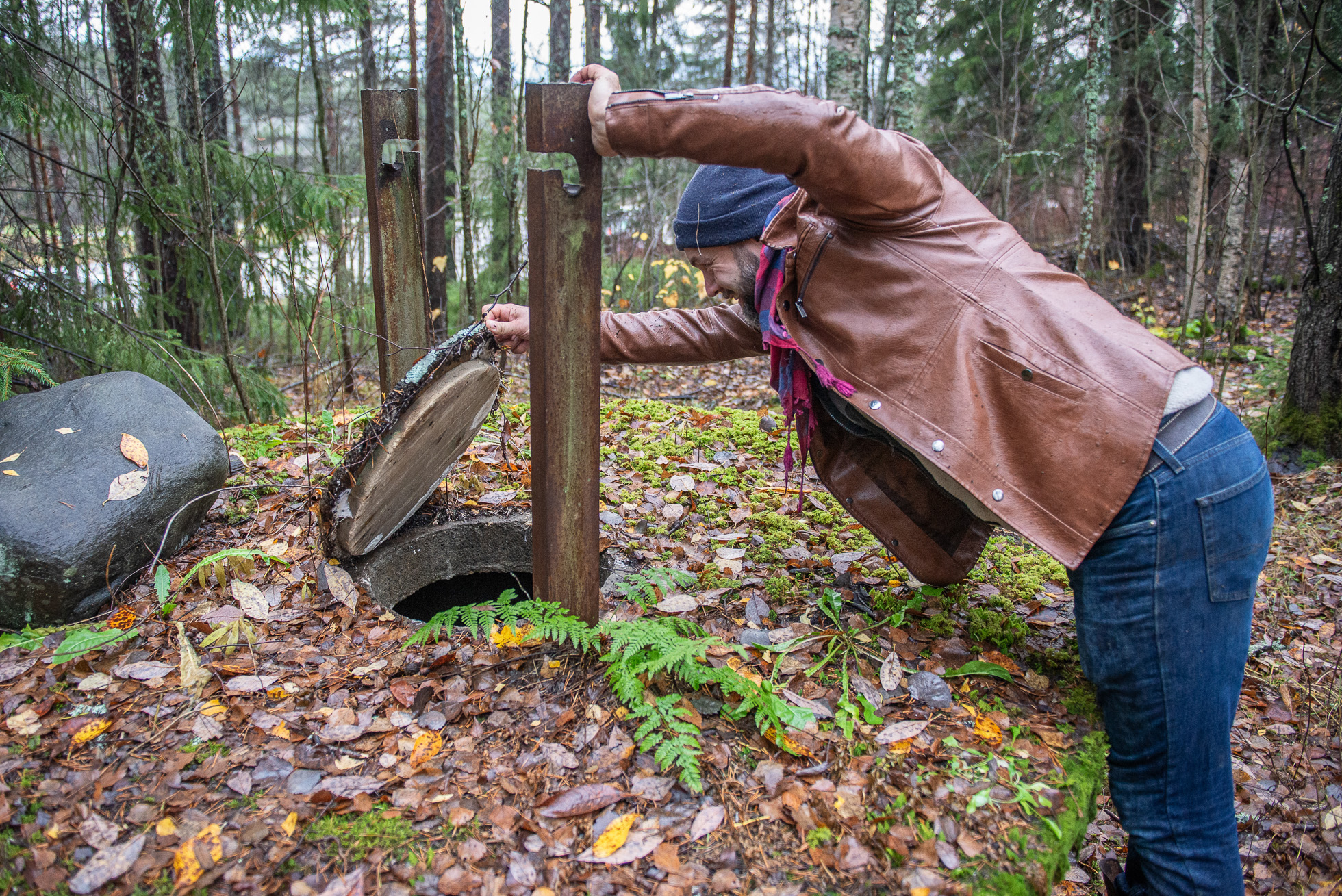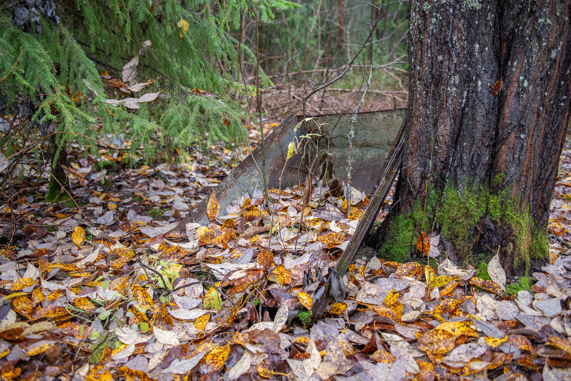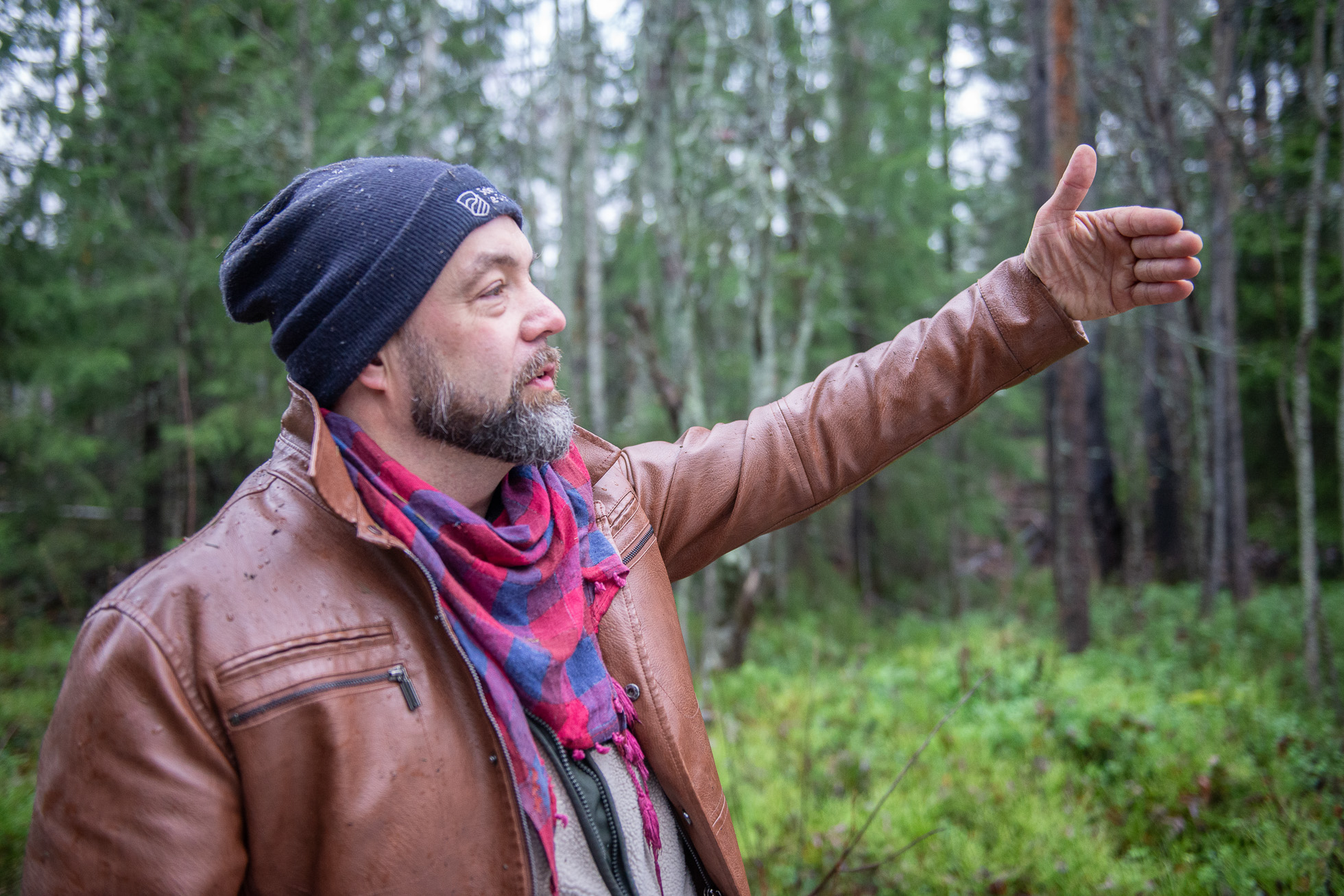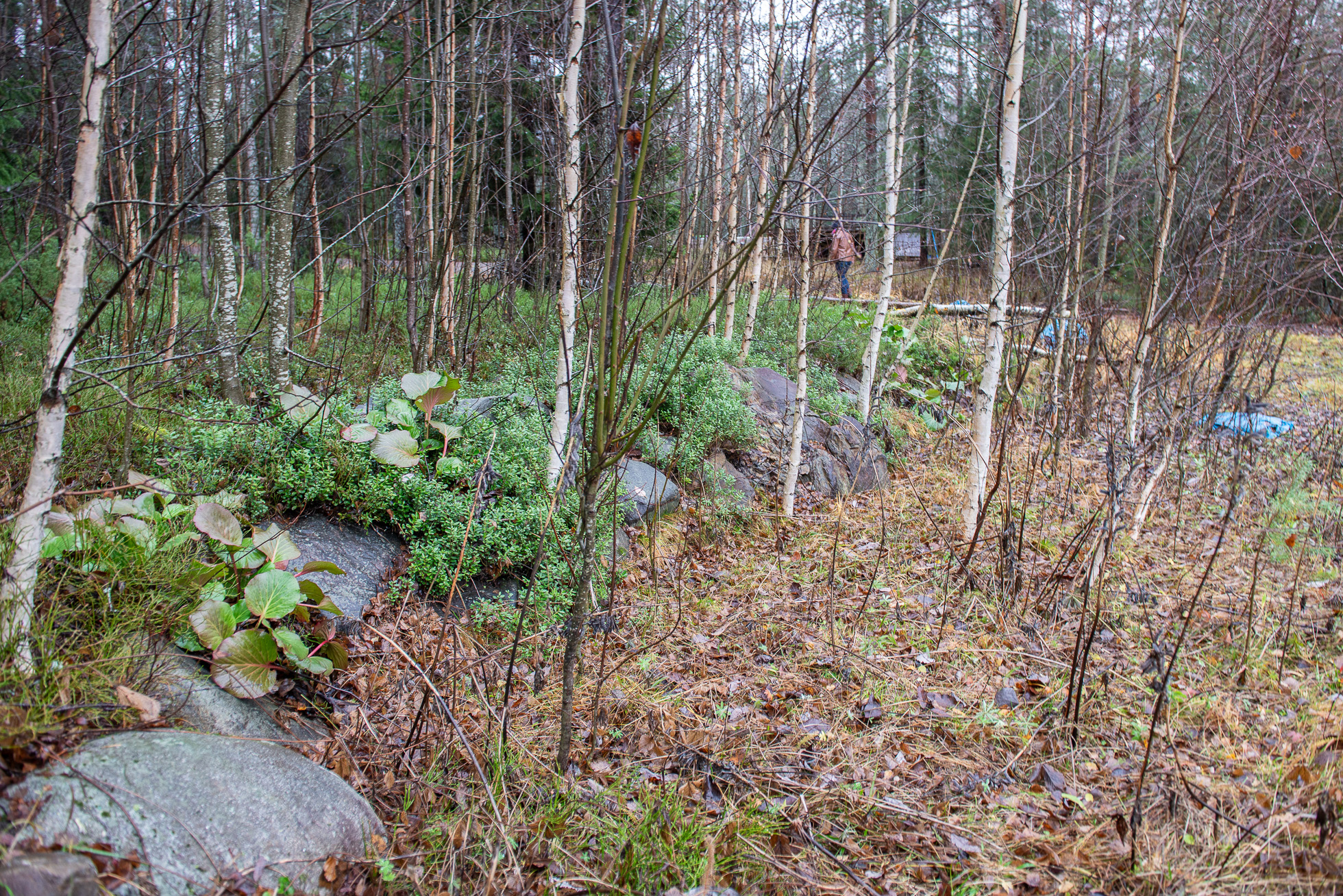 November visar sitt sanna ansikte när jag och Enar Nordvik, bygglovschef på Skellefteå kommun, anländer till området precis bredvid det som en gång var Riksväg 13 på Solbacken. Regnet hänger i luften och de vägar som en gång utgjorde en del av bostadsområdet liknas bäst vid lervälling. Hade jag inte varit här av en anledning hade jag bara sett en färgskala i grått, brunt och gult: en trasslig skog som lämnats åt sitt öde.