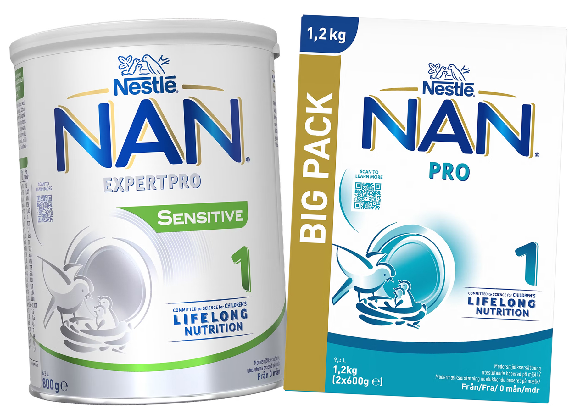 - NAN PRO 1, 1,2 kg (2x600g) i pulverform, Batchnummer 52860346BA, Artikelnummer: 12576070, EAN-kod: 8445290652829, Bäst före 04.2027.