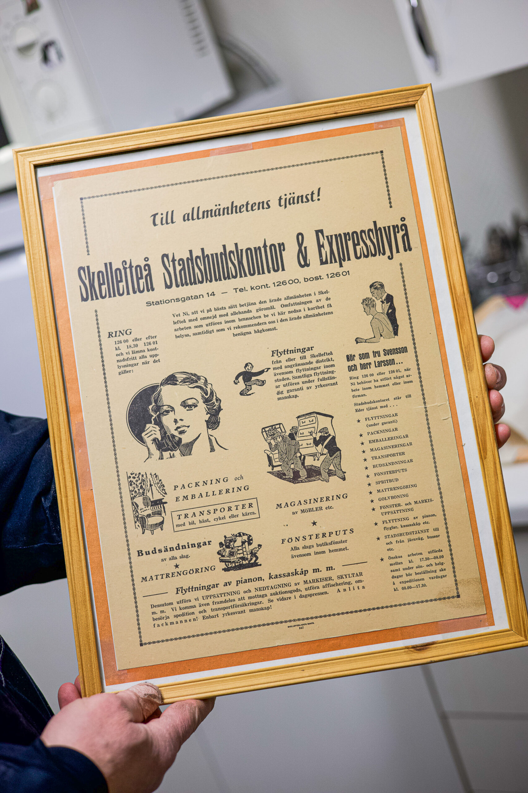 En titt på den gammal annons från 40-talet visar ett företag som verkligen gjorde allt: Flyttningar, packning, fönsterputs, markisuppsättning – till och med mattpiskning. Med moderna ögon är det underhållande läsning med budskap som ”Vet Ni, att vi på bästa sätt betjäna den ärade allmänheten i Skellefteå med omnejd med allehanda göromål.”