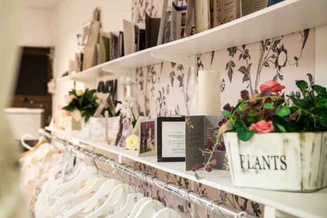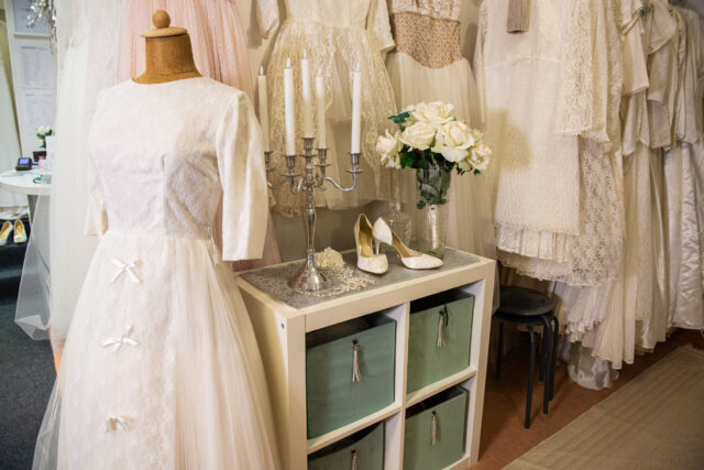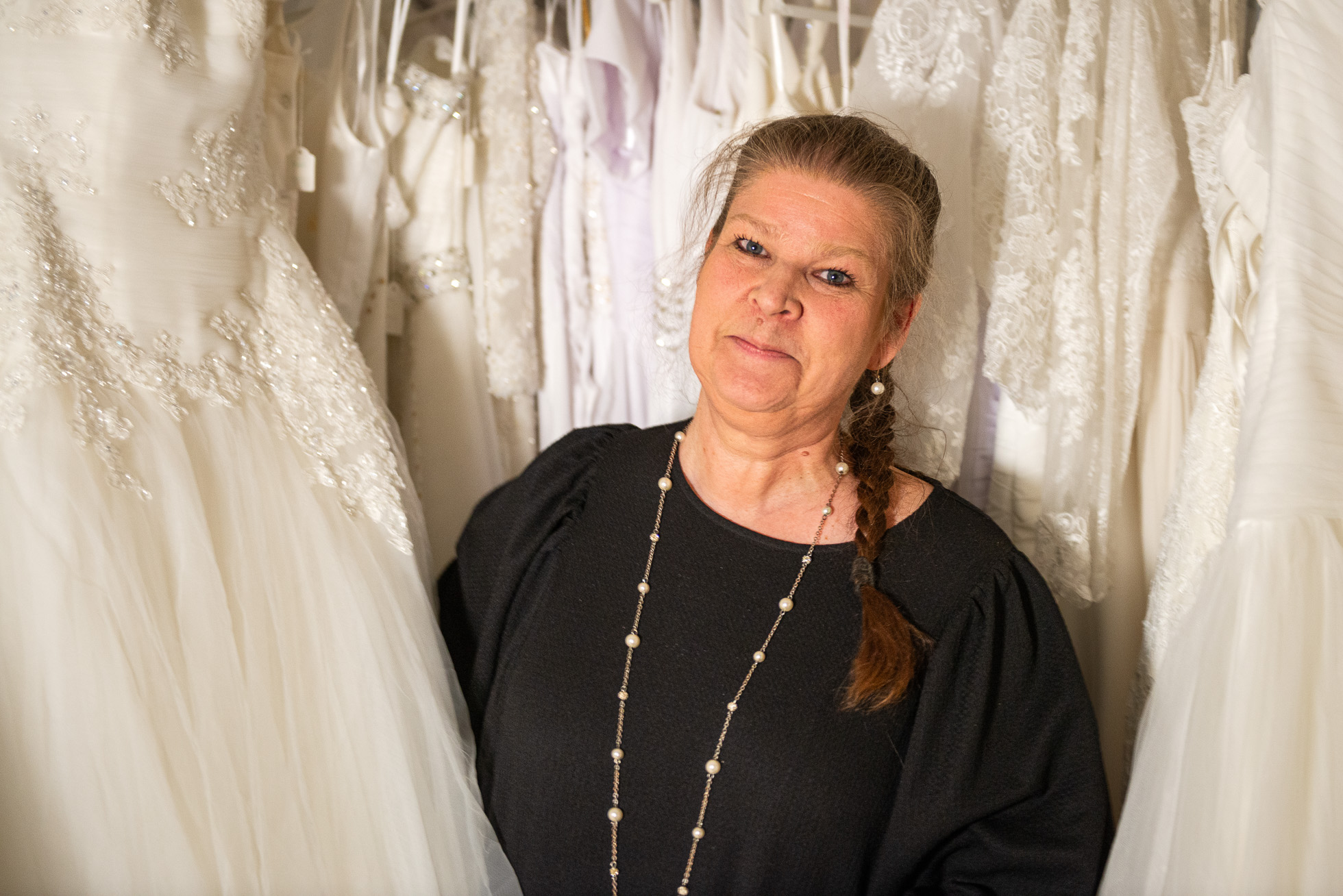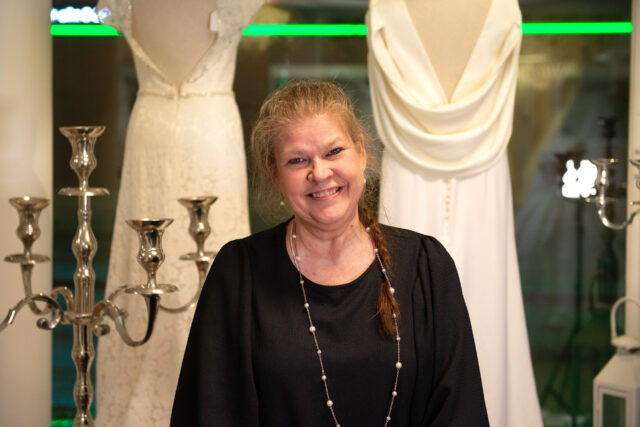 Regndropparna får ljuset från den neongröna Coopskylten att flimra när jag stiger in på Bröllopsbutiken den här mörka marskvällen. Det är efter stängningstid men dörren är öppen och det mjuka skenet i butiken skvallrar om att någon är där. Strax efter att dörrklockan pinglat kommer ägaren Nina Nyman upp för trappan från ateljén.